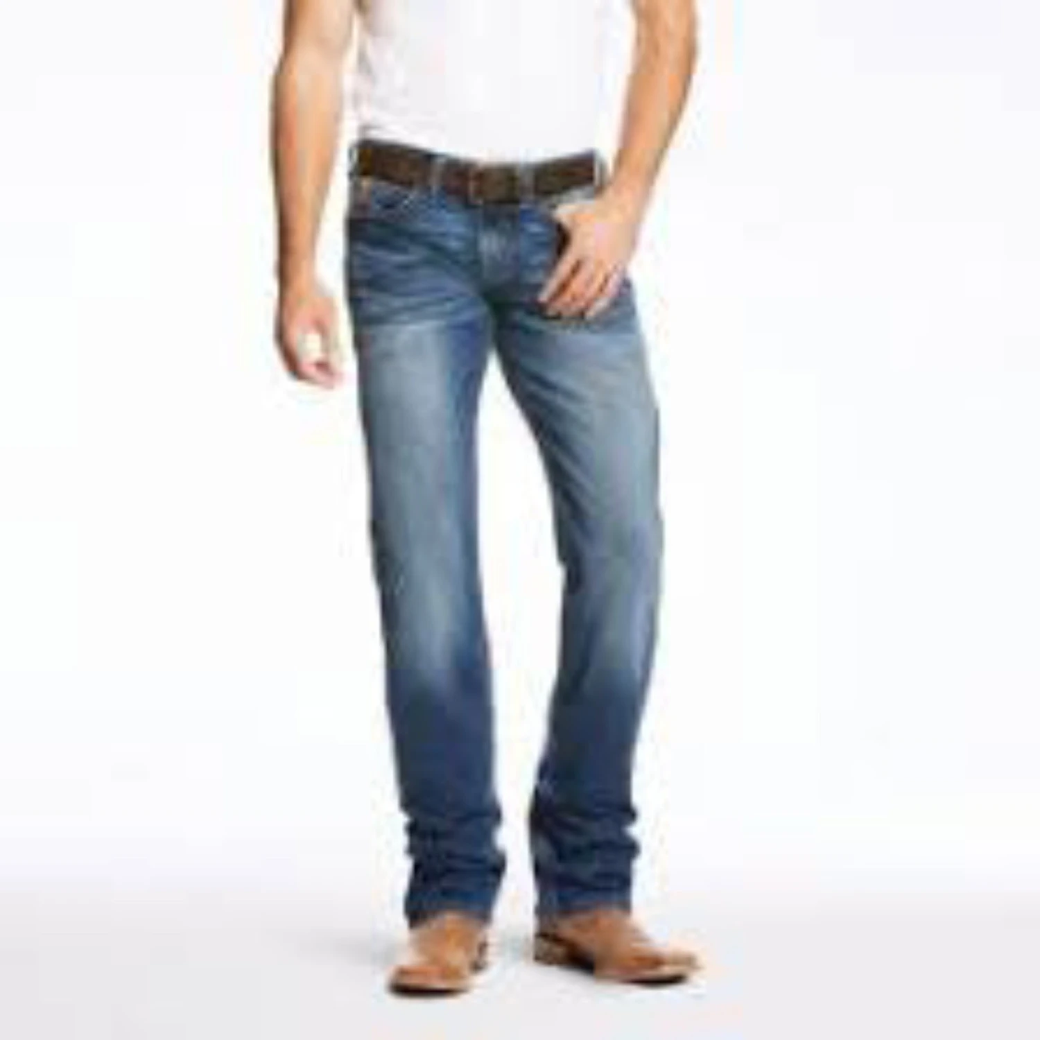 These jeans from Ariat features light blue and dark blue diamond pattern. They have a relaxed fit with a strait leg fit.Â