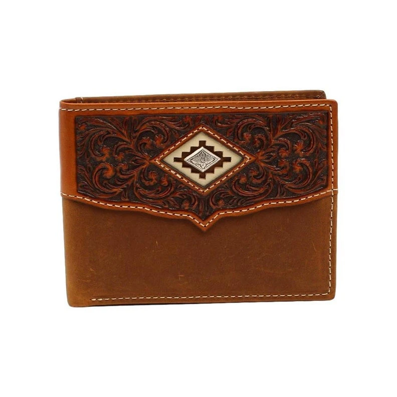 This men’s Ariat wallet is perfect for everyday use. It has a tooled top half with an overlay of a diamond with a silver concho in the middle.Â
