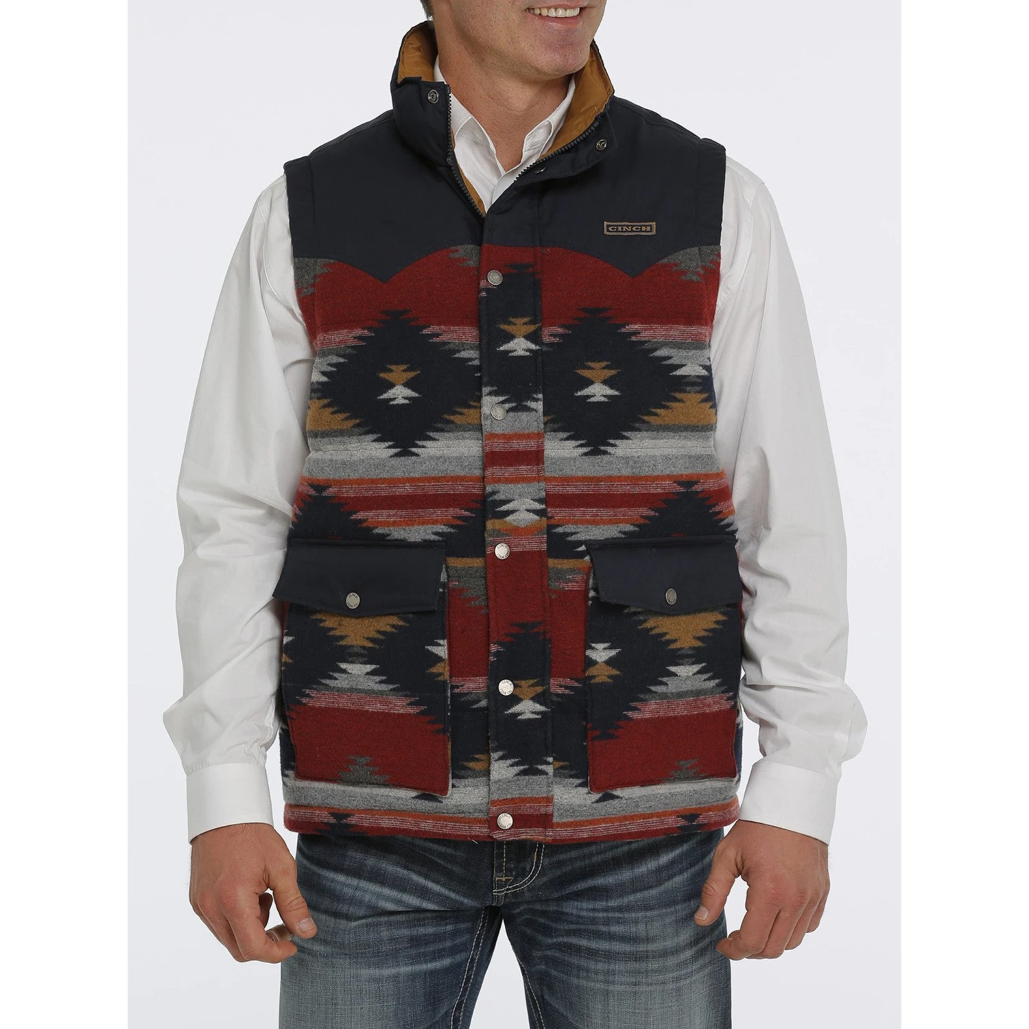 Fell warm and comfortable in this quilted vest with its striking blue Aztec pattern. It features Western yokes, a woven logo patch, storm flap and Durable Water Resistant (DWR) finish for added protection.