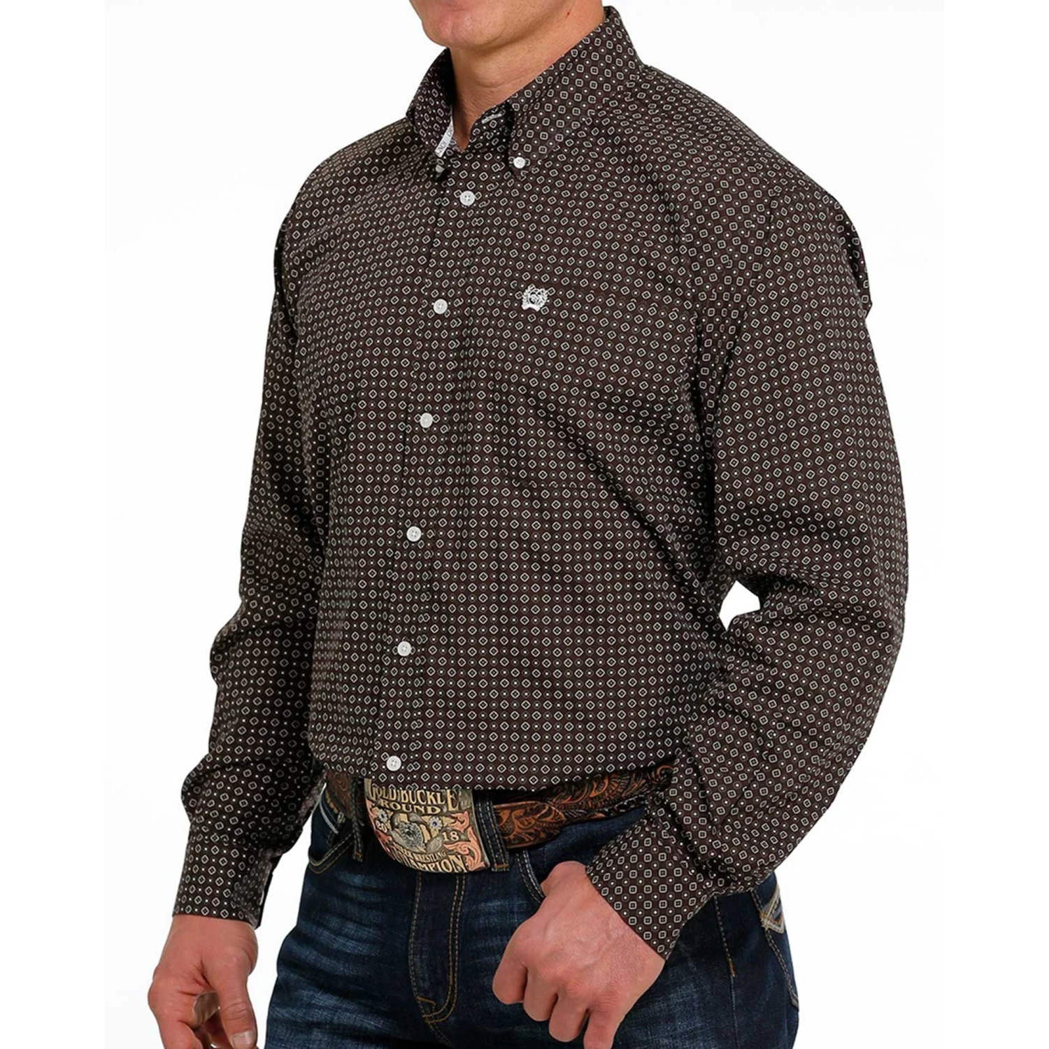 Looking for a shirt to go with jeans or khaki’s, this is it. This classic brown shirt features a geometric print, open left front pocket with embroidered logo and traditional white buttons.