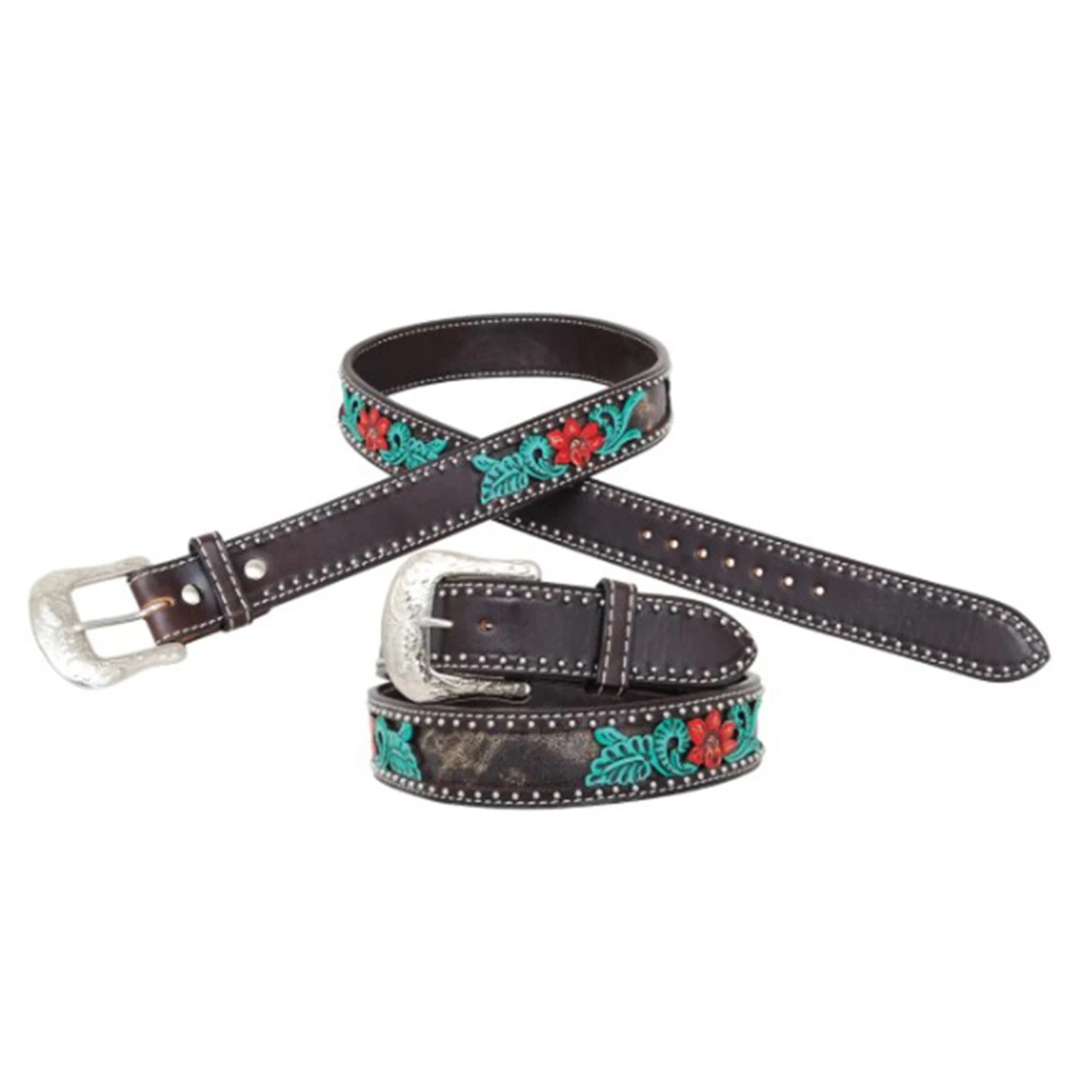 Look at this super cute cactus flower belt made by Circle Y. The outline of this belt has silver studs but the real eye catcher is the red flowers with green leaves.Â
