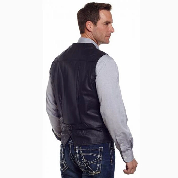 This men’s black leather vest is perfect for occasion! It has snaps in the front and an adjustable belt in the back!