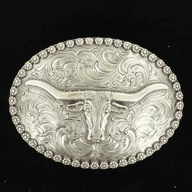 This buckle from M&F Western Products® is stunning. There is a scrolling pattern background with longhorn in the center featuring a berry edge.