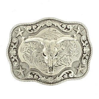 This buckle from M&F Western Products® is stunning. There is a scrolling pattern background with steer skull motif in the center. Rope edge.