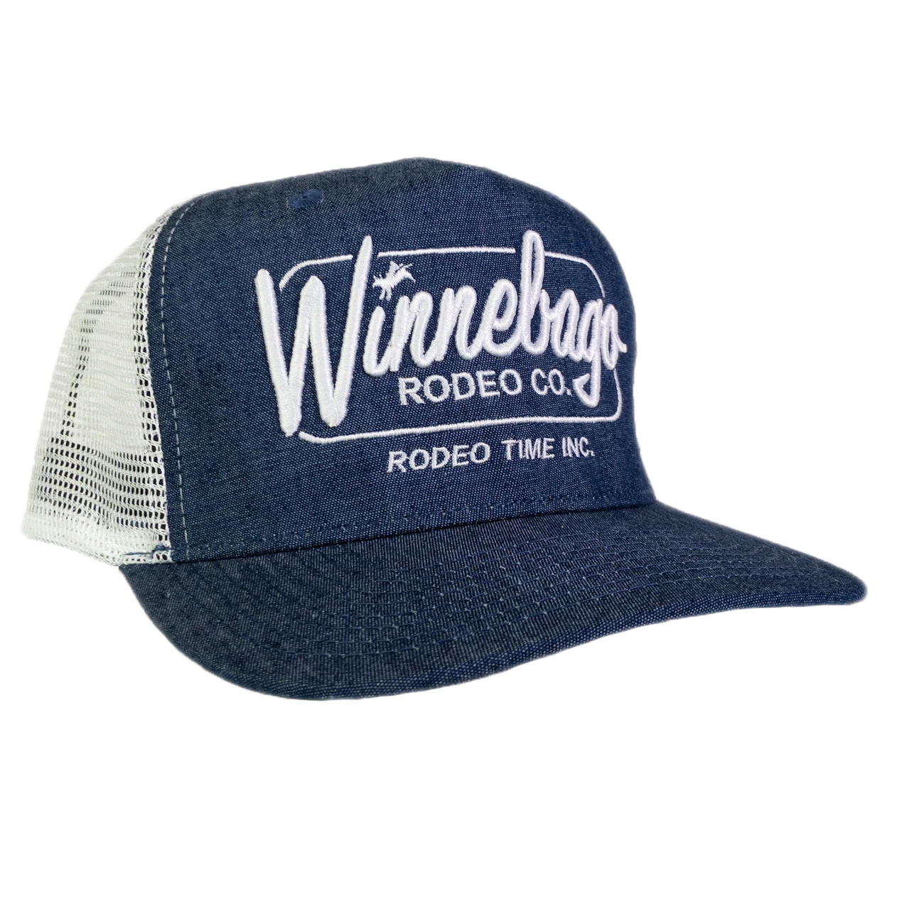 Winnebago Rodeo Co. Denim and White Mesh Back, Flat Bill Cap.Â