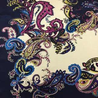 This navy and white wild rag is highlighted with a frenzy of blue, fuchsia, and yellow paisley swirls.